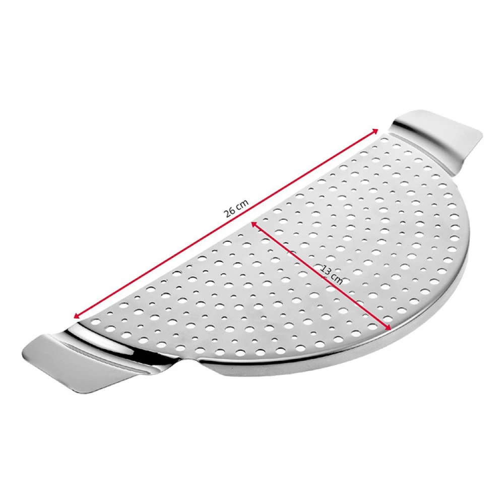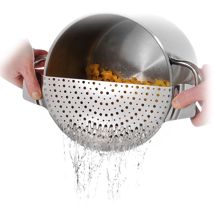 Det flade dørslag er meget nemt at bruge og lægges som låg over gryden, så det dækker den ene side, hvor du skal hælde vandet fra. Dørslagets håndtag, sidder på siderne og ved også at tage fat i grydens “ører” kan du roligt og kontrolleret hælde vandet fra, mens kartoflerne eller pastaen bliver i gryden.