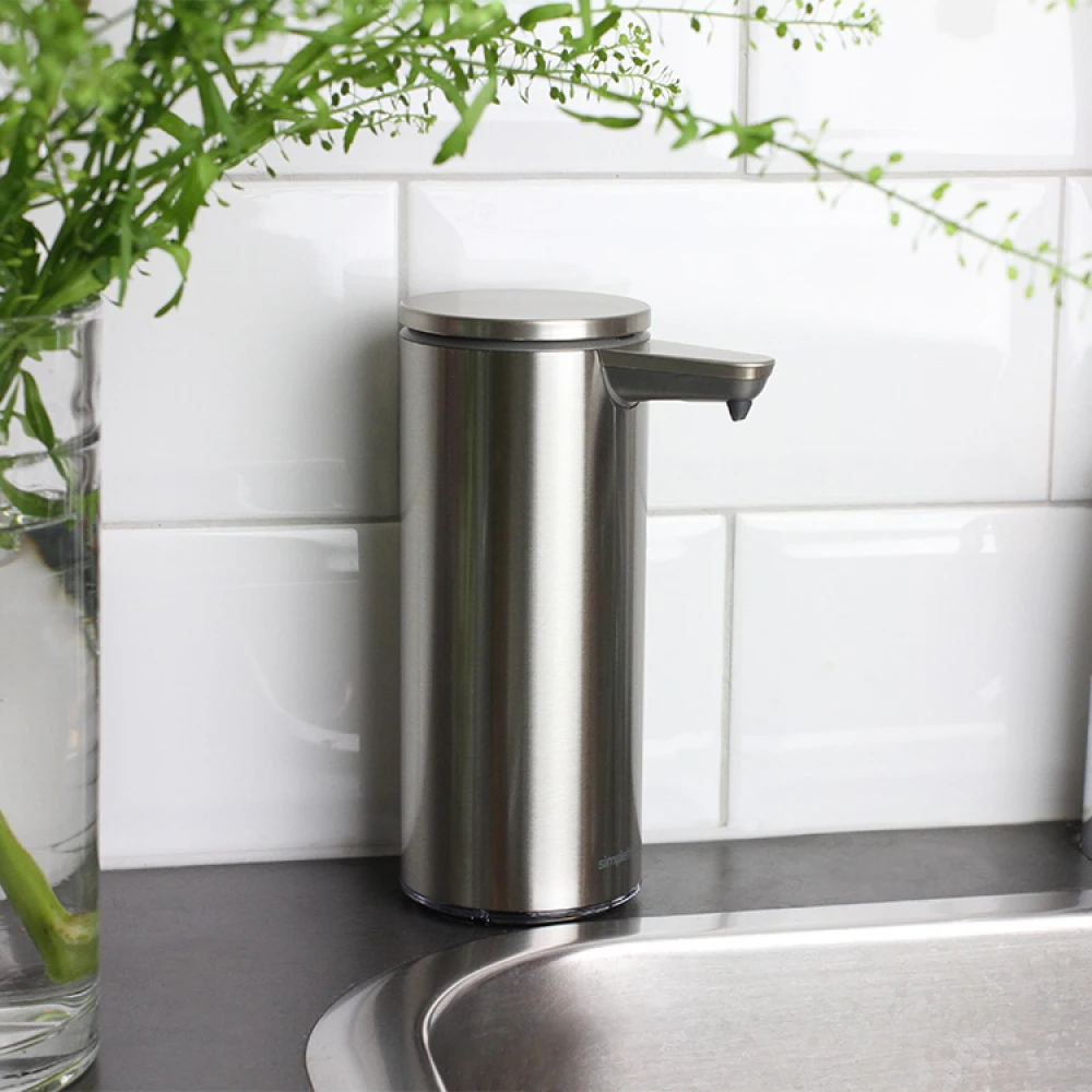 Sæbepumpens sensor er placeret under dysen og fornemmer, hvor tæt du holder din hånd. Holder du den langt nede, får du meget sæbe og holder du hånden tæt på mundstykket, får du kun lidt sæbe i hånden.