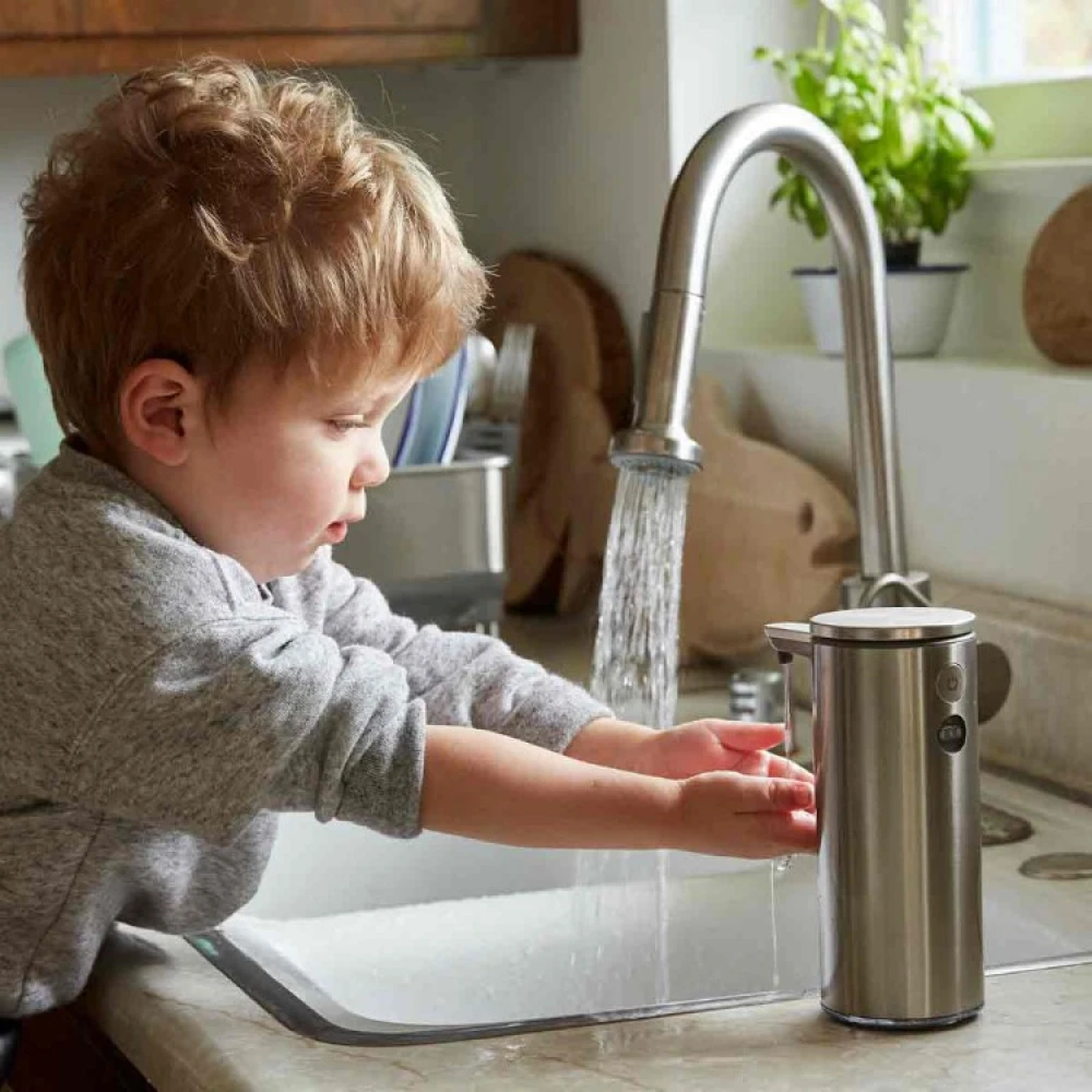 Genopladelig og hygiejnisk sæbepumpe, der doserer sæbe uden at du skal røre ved pumpen. Sæbepumpen er vandtæt, drypfri og nem at oplade via USB.