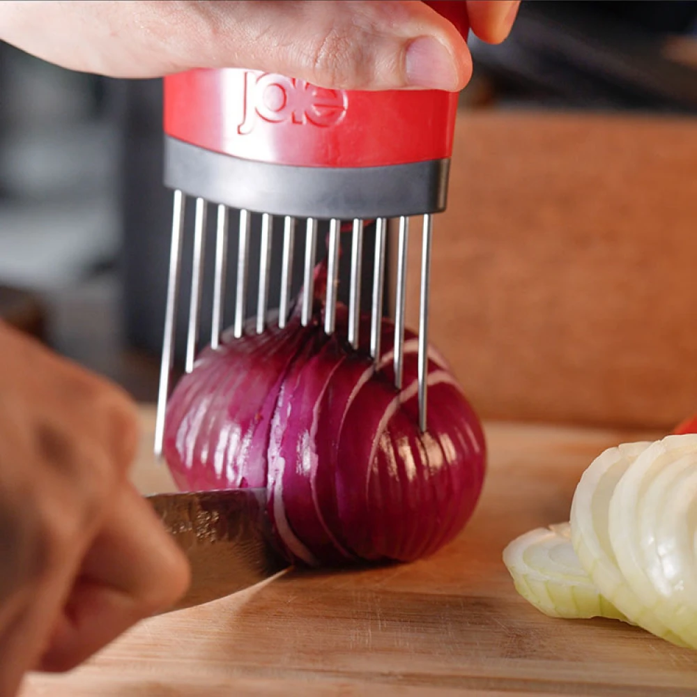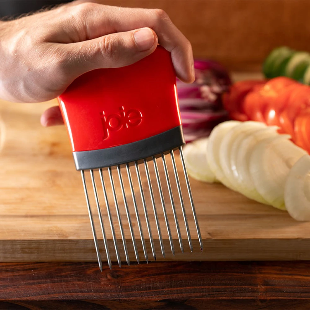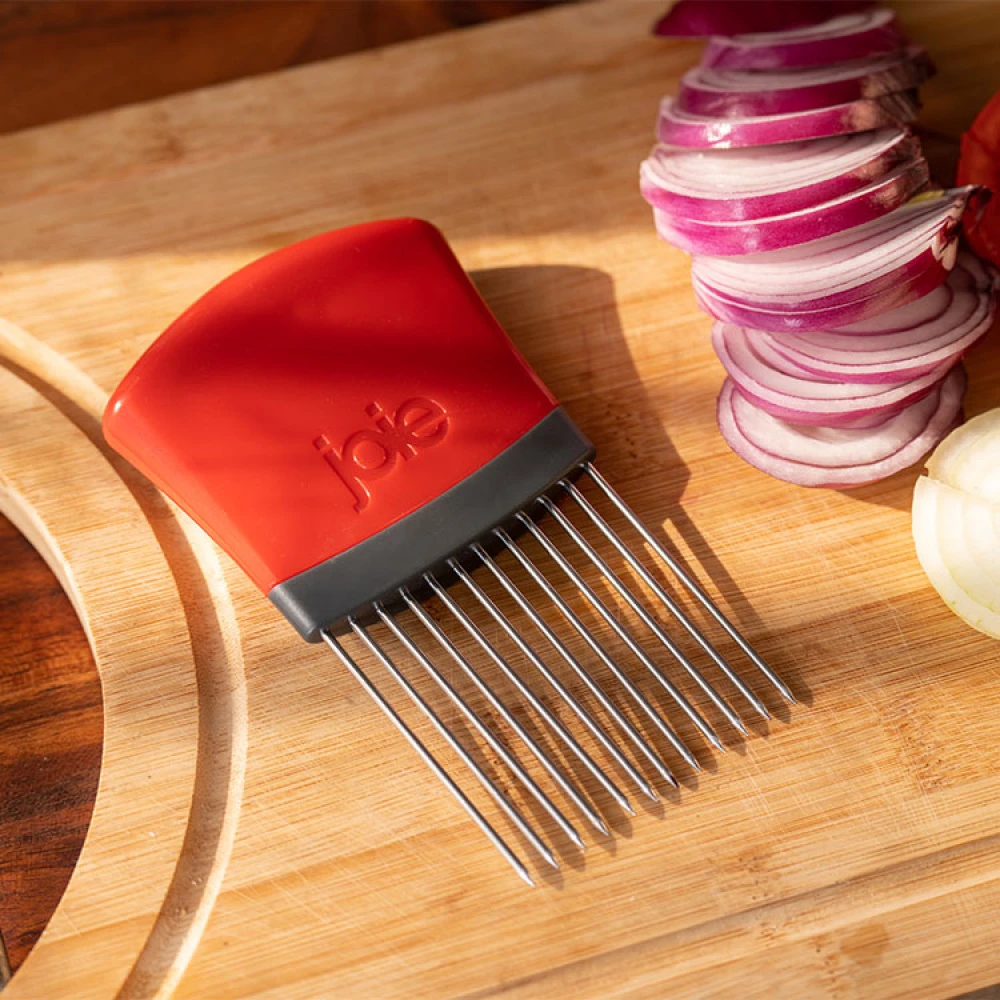 Denne smarte grøntsagsholder giver dig et fast greb om både frugt og grønt. Med grøntsagsholderen holder du fingrene væk og kan trygt skære lige skiver af for eksempel tomater, løg eller mozzarella.