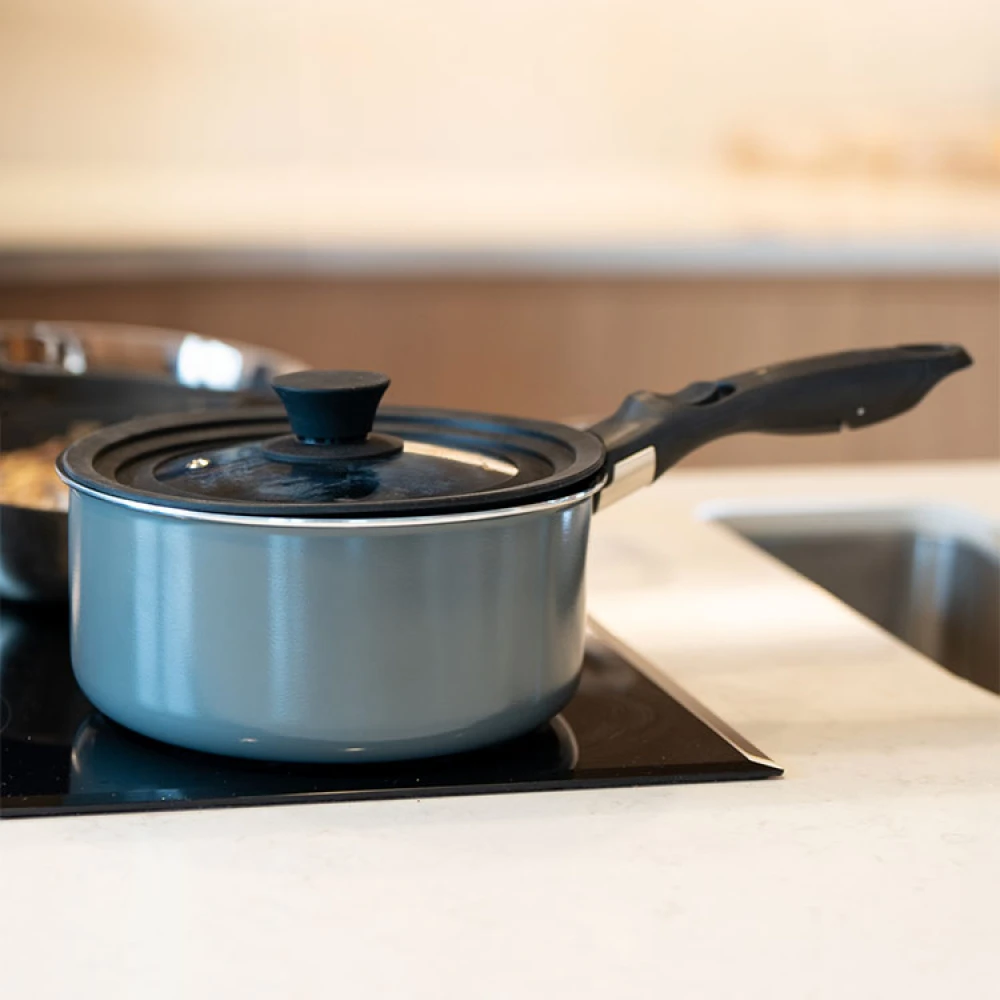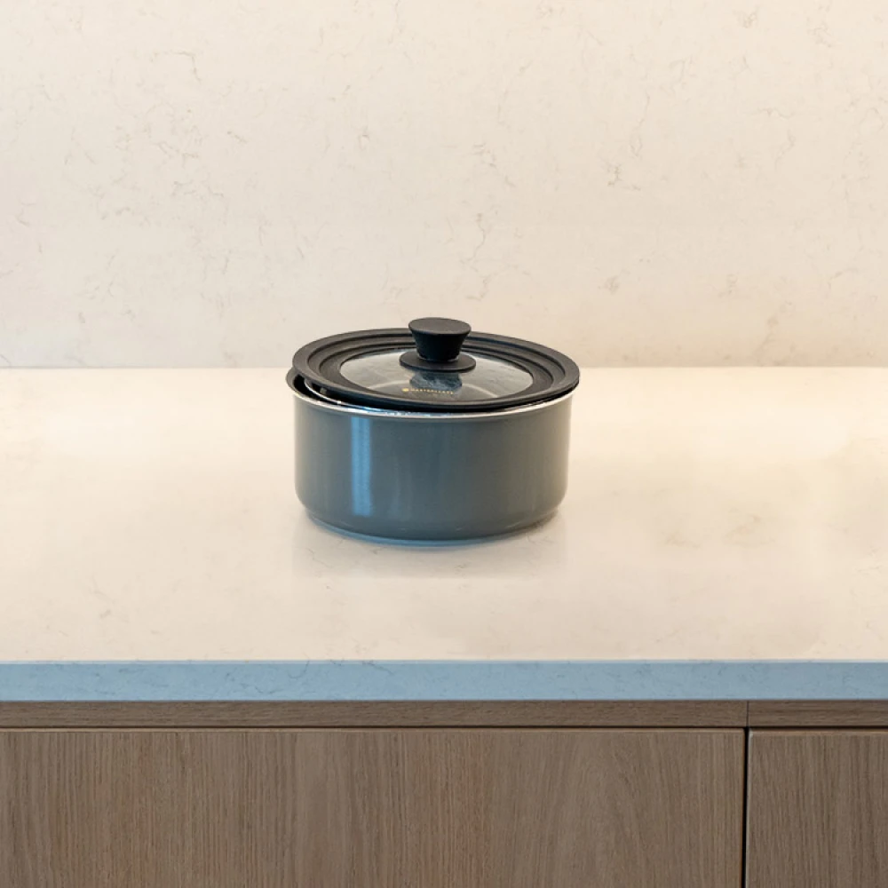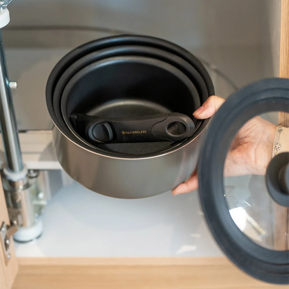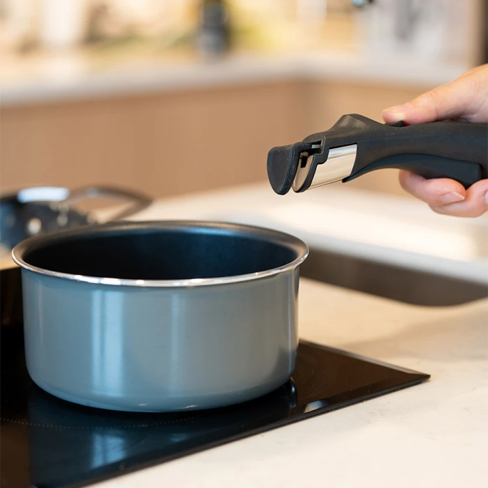 Smart grydesæt med tre pladsbesparende gryder i forskellige størrelser, der kan stables sammen. Gryderne er 16 cm, 18 cm og 20 cm i diameter og kan bruges til alt fra tilberedning af saucer, gryderetter og gryderetter til kogning af kartofler og pasta. Pandesættet leveres med et aftageligt håndtag og et universallåg, der passer til alle tre gryder.