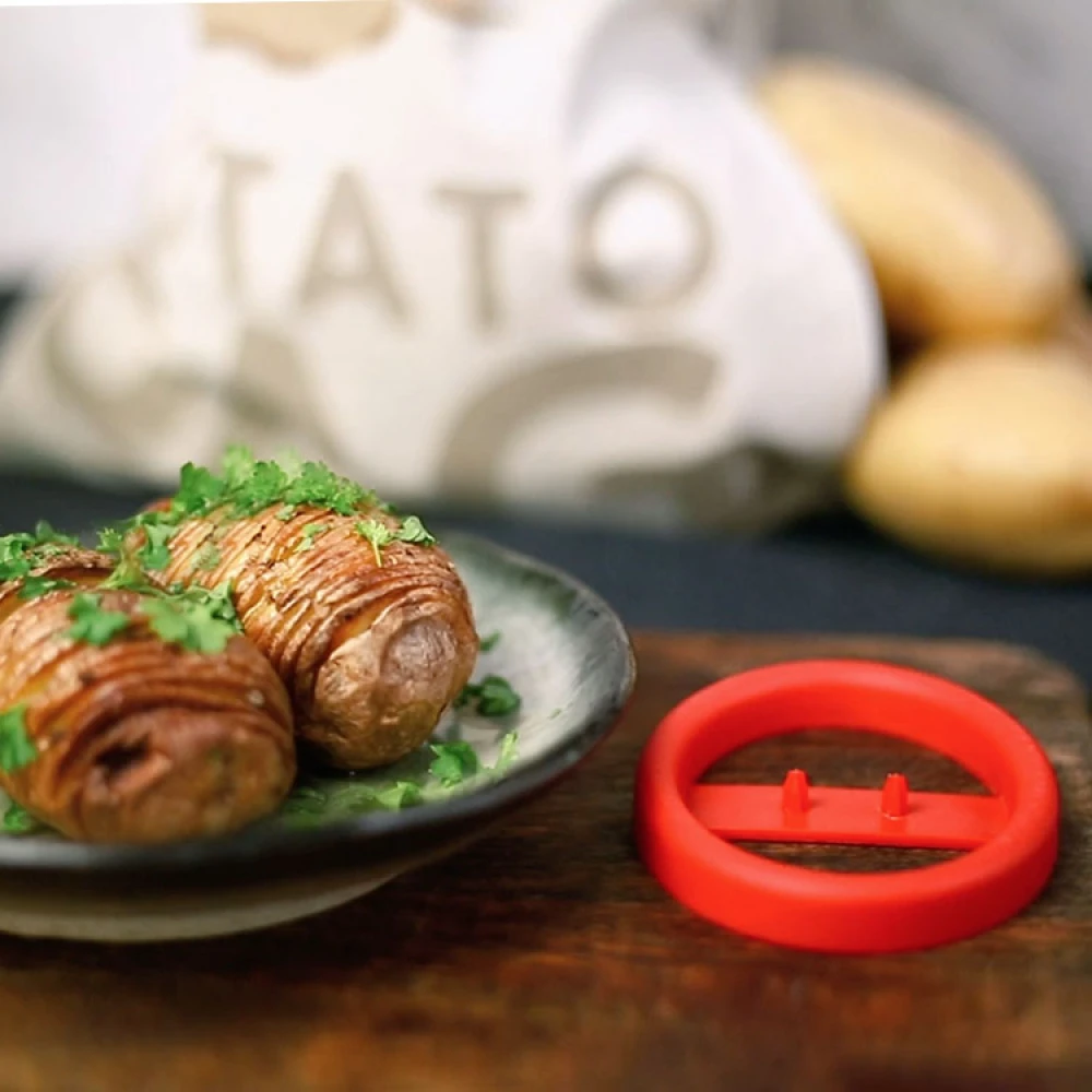 De to pigge i midten af hasselbackeren holder kartoflerne fast, så de bliver faste at skære. Formens kanter giver perfekte dybe snit og forhindrer kniven i at skære gennem hele kartoflen. Kartoflerne hænger sammen i ovnen og der bliver perfekte hasselback kartofler hver gang.
