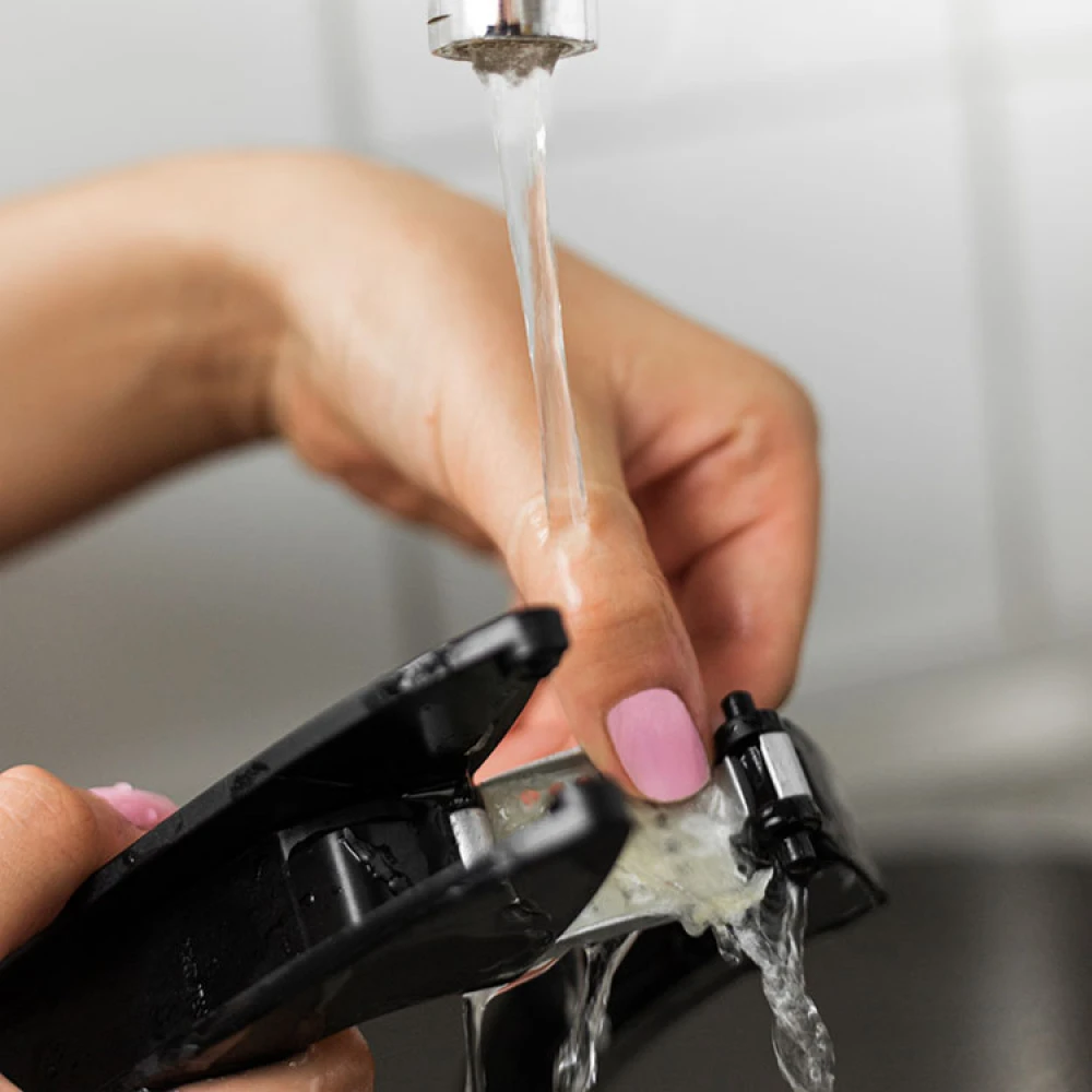 Hvidløgspressen har integrerede rensepigge på den modsatte side af pressehovedet. Når hvidløget er presset, foldes bagsiden af pressearmen hele vejen, så piggene kommer rundt og prikker de resterende hvidløg tilbage ud af hullerne. Klik derefter pressearmen ud af hængslet for at få adgang til hullerne, der nu kan skylles så let som ingenting.