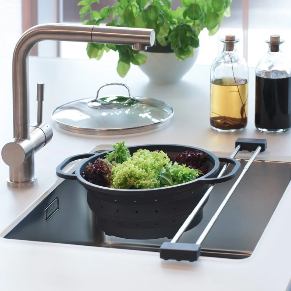Skillevæggen er meget praktisk, når du skal bruge dørslaget i store vaske. I store vaske, der ellers er for brede, giver skillevæggen dig mulighed for at hænge dørslaget op, når du dræner pastavand og skyller grøntsager. Det er smart og hygiejnisk, da siven ikke længere behøver at stå i bunden af vasken.