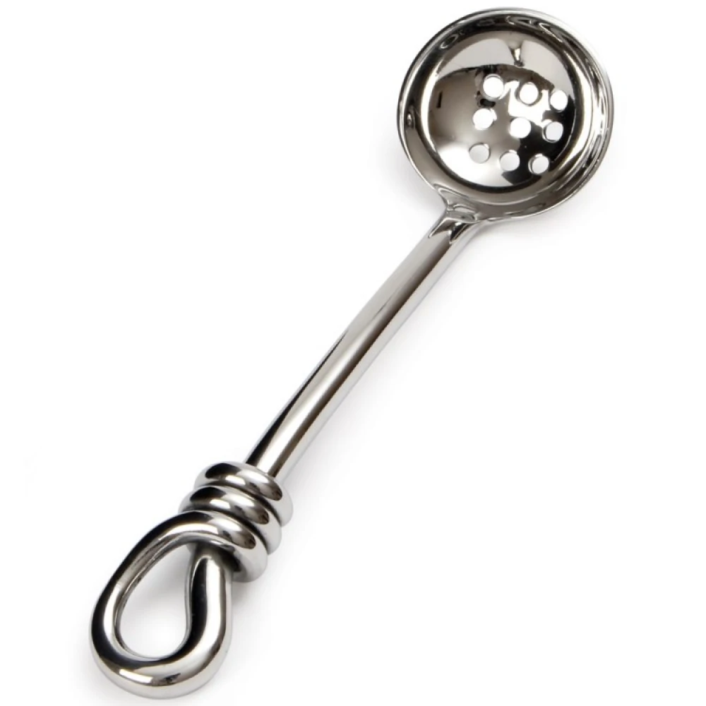 Den lille ske er perforeret med flere huller der fungerer som en slidske. Når du tager oliven op med oliveskeen, kan olivenresterne og olien løbe gennem de små huller i skeen og tilbage i glasset.
