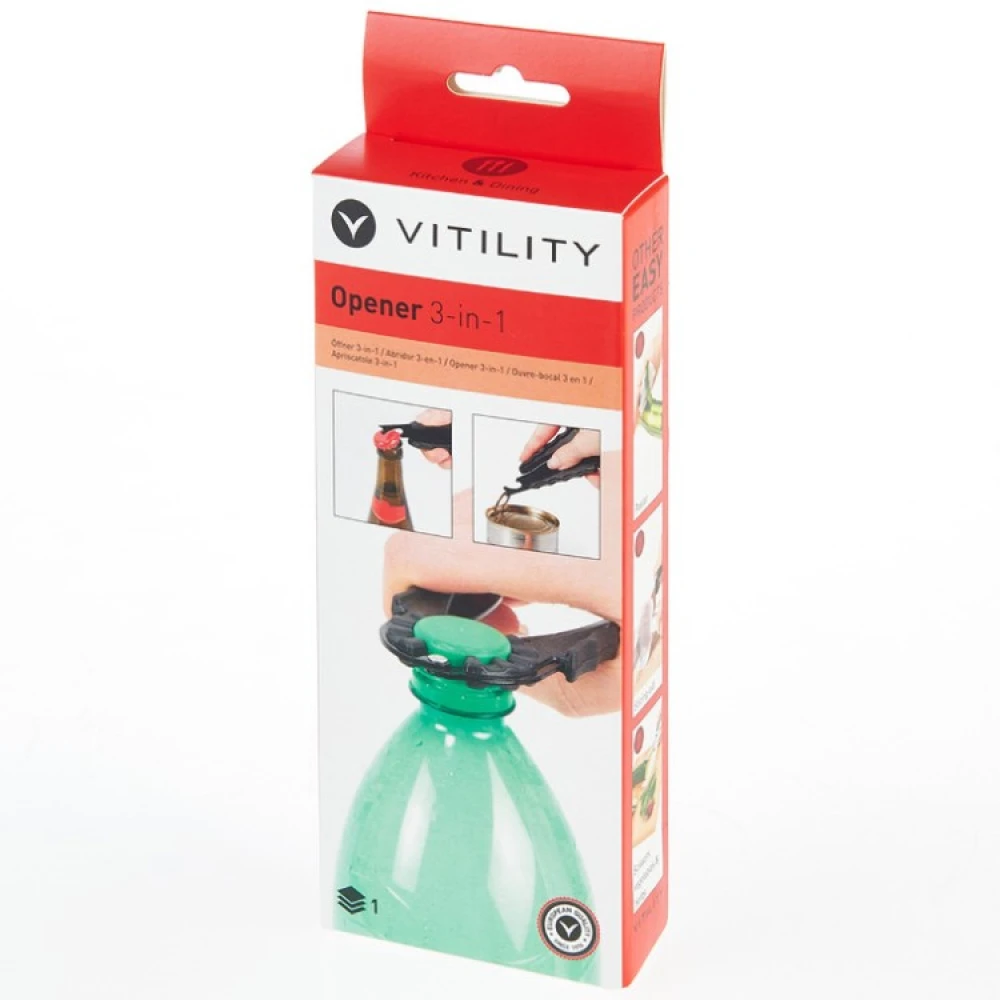 Ergonomisk flaskeåbner med godt greb i håndtaget, der gør det nemt at åbne skruelåg på PET-flasker og mælkekartoner. Med værktøjet på bagsiden kan du åbne dåser med låg eller bruge kapselåbneren til at åbne plastik- eller glasflasker.