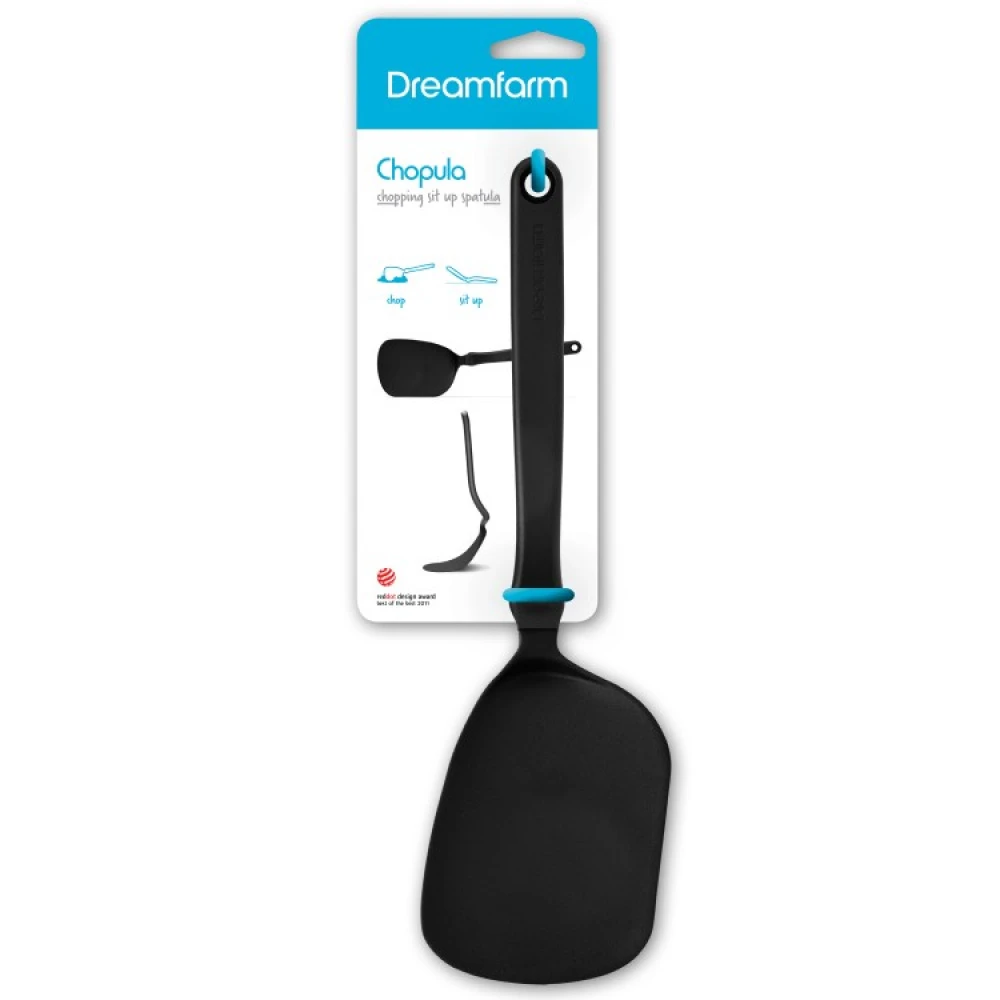 Den prisbelønnede Chopula-spatel er en bred, tynd og fleksibel spatel med en hård kort side, der kan hakke og dele ting i gryden. Det smart designede håndtag giver dig også mulighed for at placere spatlen ved siden af komfuret uden at gøre bordet beskidt.