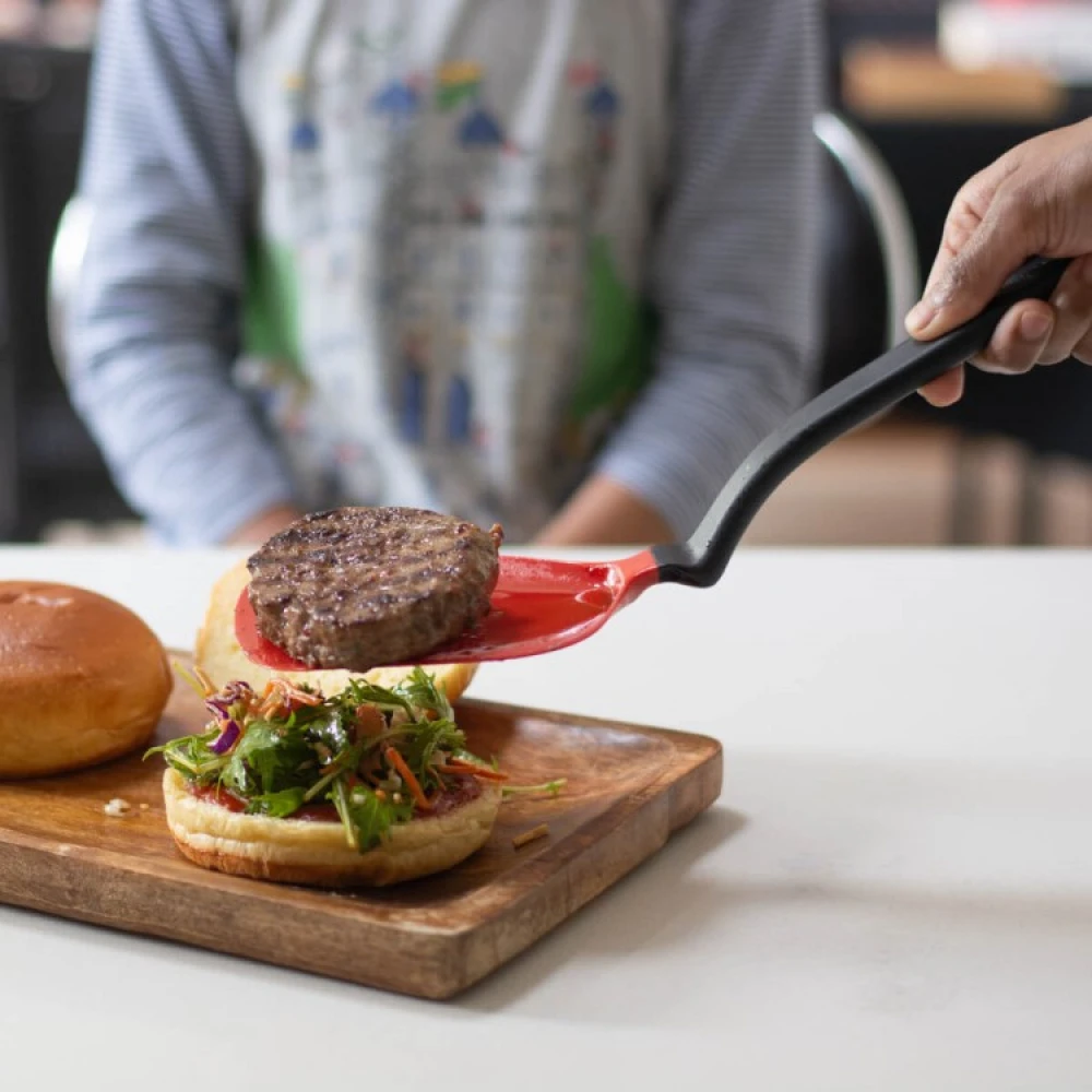 Håndtagets smarte design fungerer som et lille stativ for spatlen og sikrer, at spatlen ikke hviler direkte mod vasken. Bagsiden af spaden har også en lille kant, der opfanger olie og andet madlavningsfedt, så vasken holdes hygiejnisk og ren.