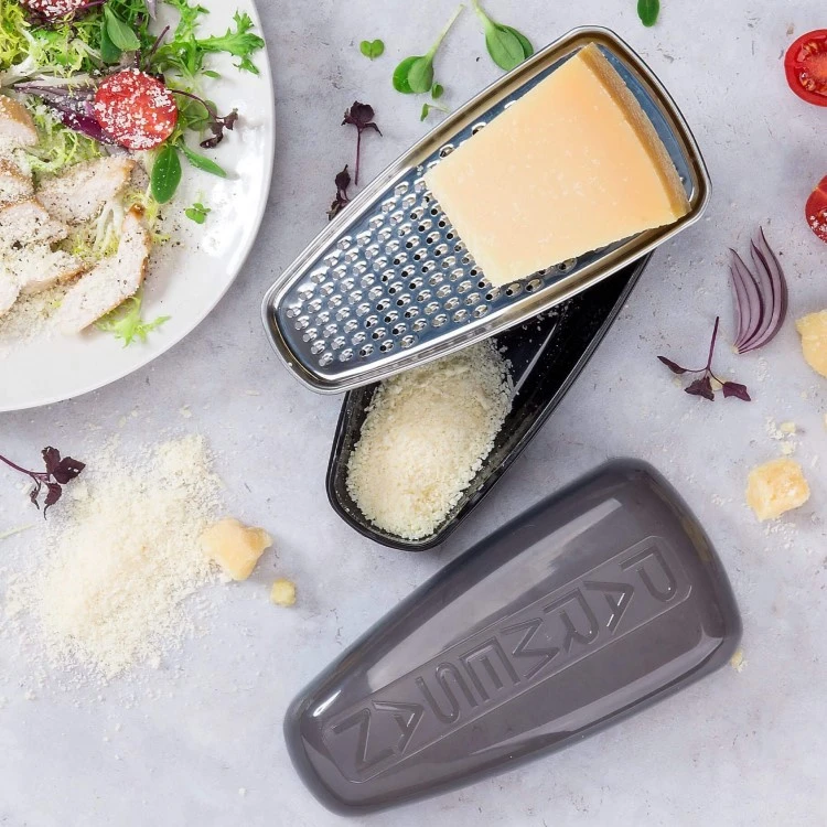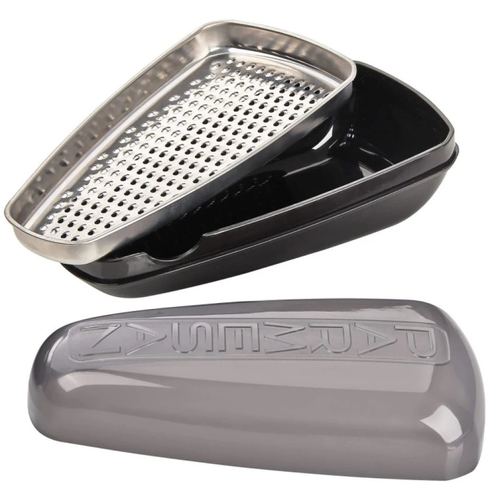 Det aftagelige rivejern inde i opbevaringskassen er lavet af rustfrit stål og er meget skarpt. Du kan enten rive osten, når rivejernet står i beholderen, men også tage rivejernet op, hvis du vil rive osten direkte over maden.