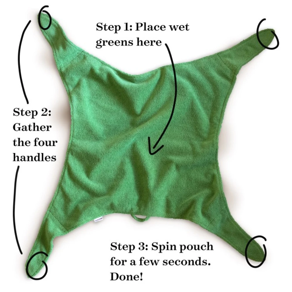 Salatslyngen er et effektivt alternativ til klodsede og svære at vaske salatslynger. Du tørrer salaten ved at svinge salatslyngen over hovedet i et par sekunder. Centrifugalkraften får vanddråberne til at blive slynget ind i mikrofiberkluden og salatbladene tørres uden skader.