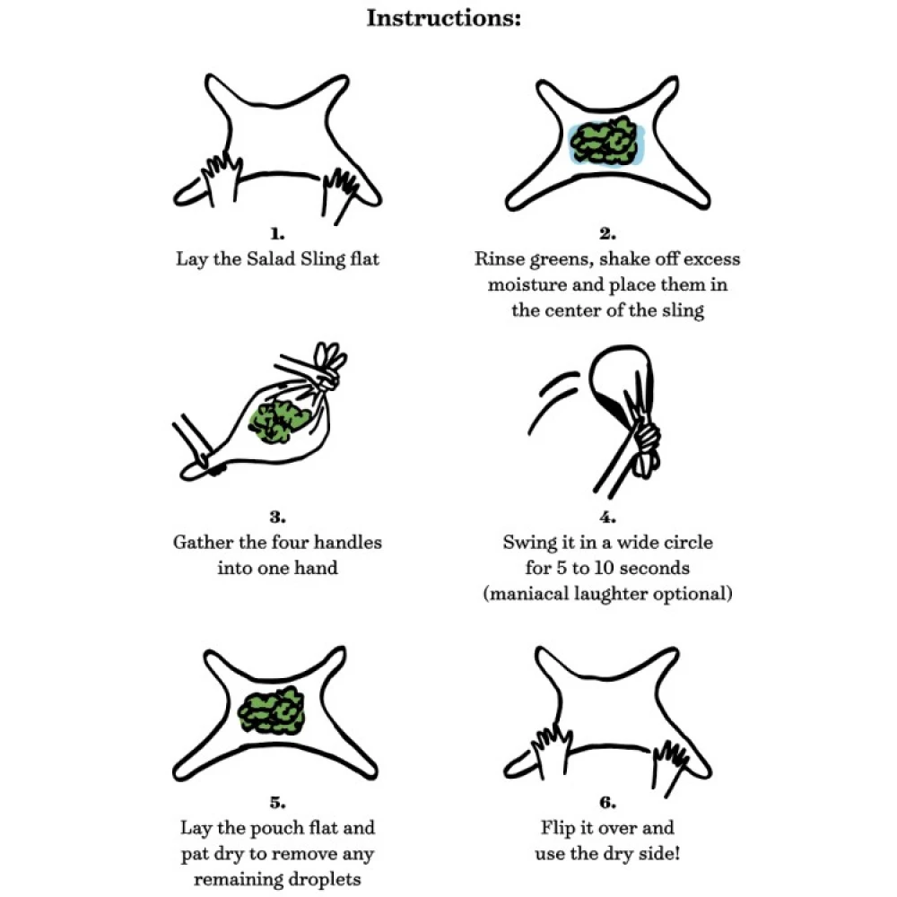 The Salad Sling er en innovativ salatslynge lavet af et superabsorberende mikrofibermateriale, der tørrer dine skyllede grøntsager på ingen tid. Den effektive salatslynge er nem at bruge, fylder lidt og kan bruges til at tørre alt fra salat og grøntsager til frugt og bær.