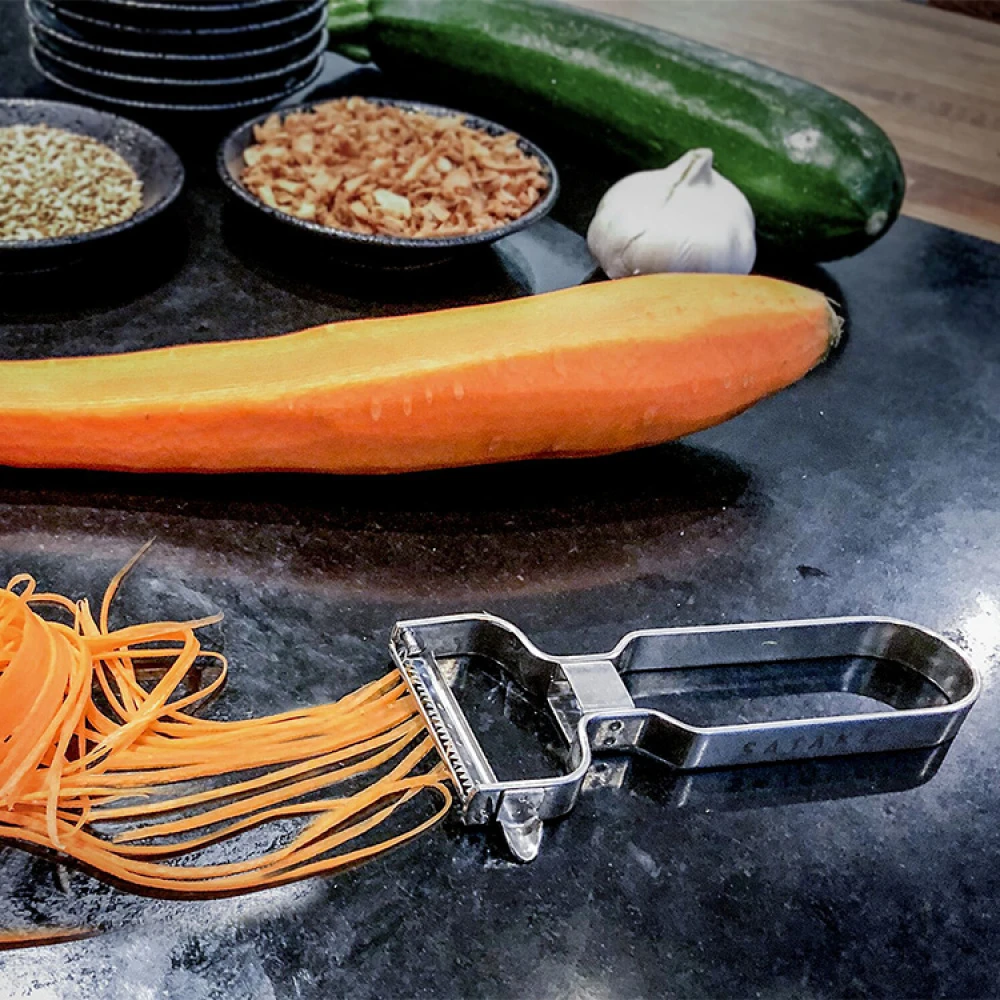 Lav en god papayasalat eller lav grøntsagsspaghetti med en rigtig kvalitets spiralizer fra Satake, som er en japansk producent af køkkenknive fra Seki, der er kendt som en knivproducent-by. Grøntsagsstrimleren er et praktisk værktøj til vegetarretter, dekorative salater eller som professionel pynt på tallerkenen. Bladet er titaniumbelagt for at holde skarpheden og grebet passer til både højre og venstre hånd.Grøntsagstrimleren tåler opvaskemaskine og har 10 års garanti.