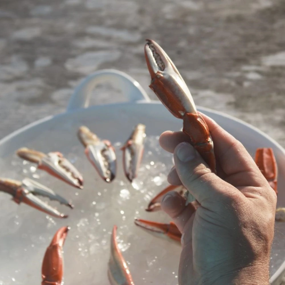 Tag kloen og klip med skaldyrsknækkeren lige under kloleddet. Træk derefter forsigtigt kloen fra hinanden for at få adgang til klokødet. Krabbesaksen fungerer bedst på små til mellemstore krabber, hummere og krebs med en maksimal klostørrelse på cirka 3-4 cm i diameter.