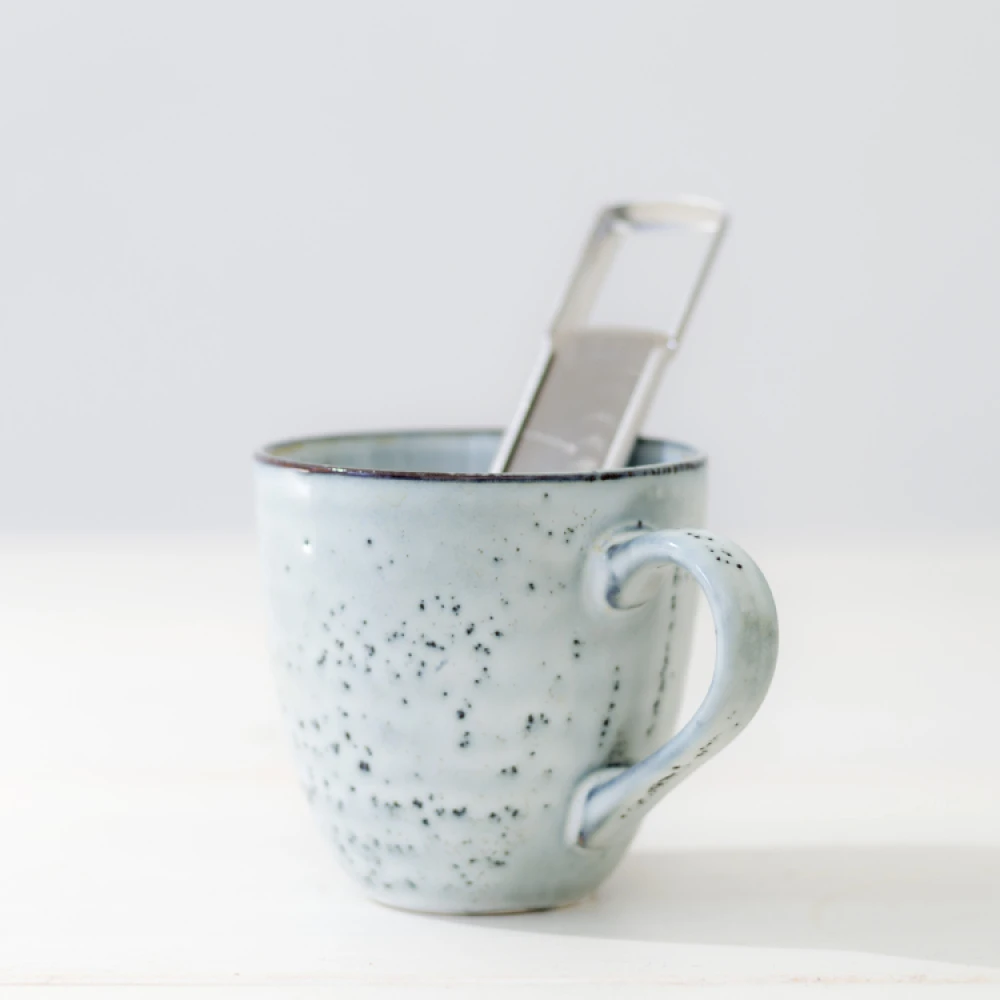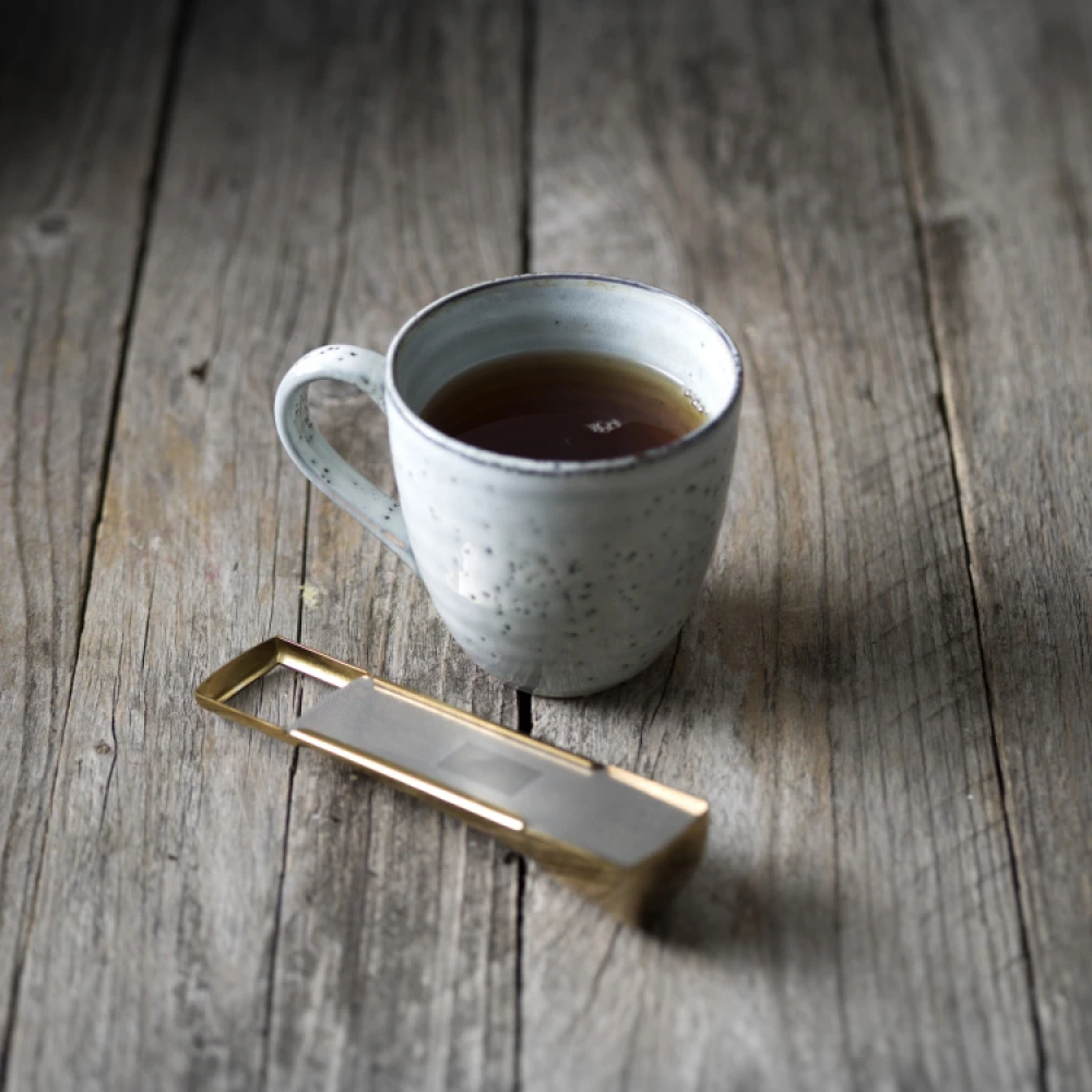 Når din te er færdig med at brygge, skal du si vandet fra, op mod kanten af koppen. Derefter kan du lægge teen ned på en måtte eller direkte på bordet. Selve skeen er perforeret, så der er minimal drypning.