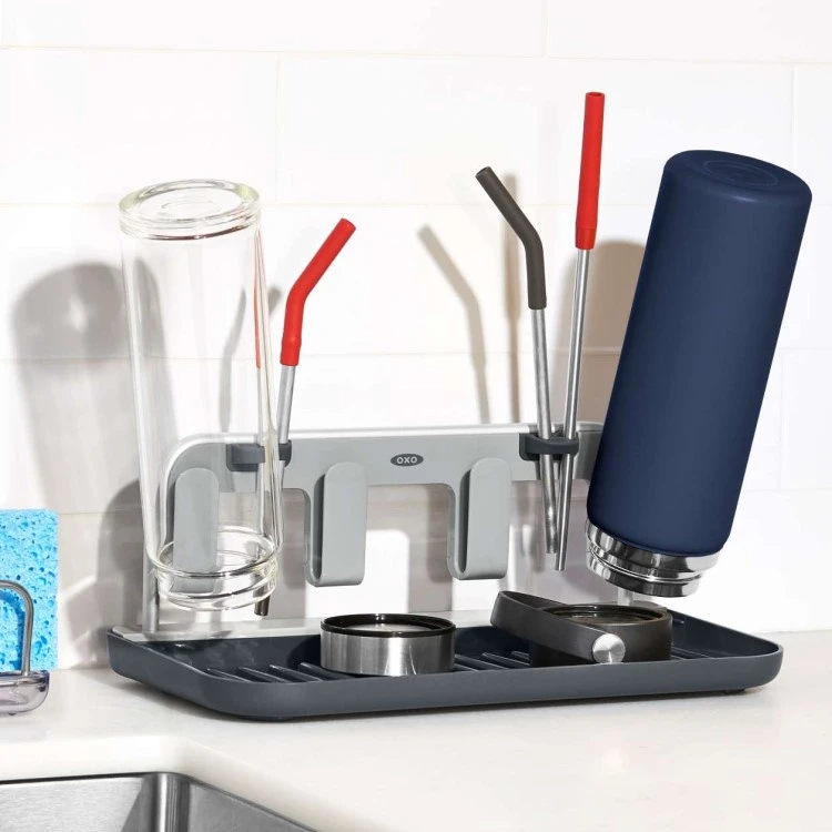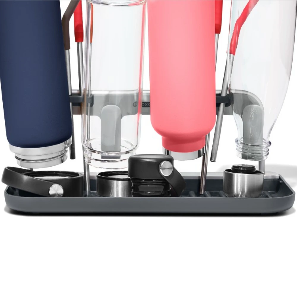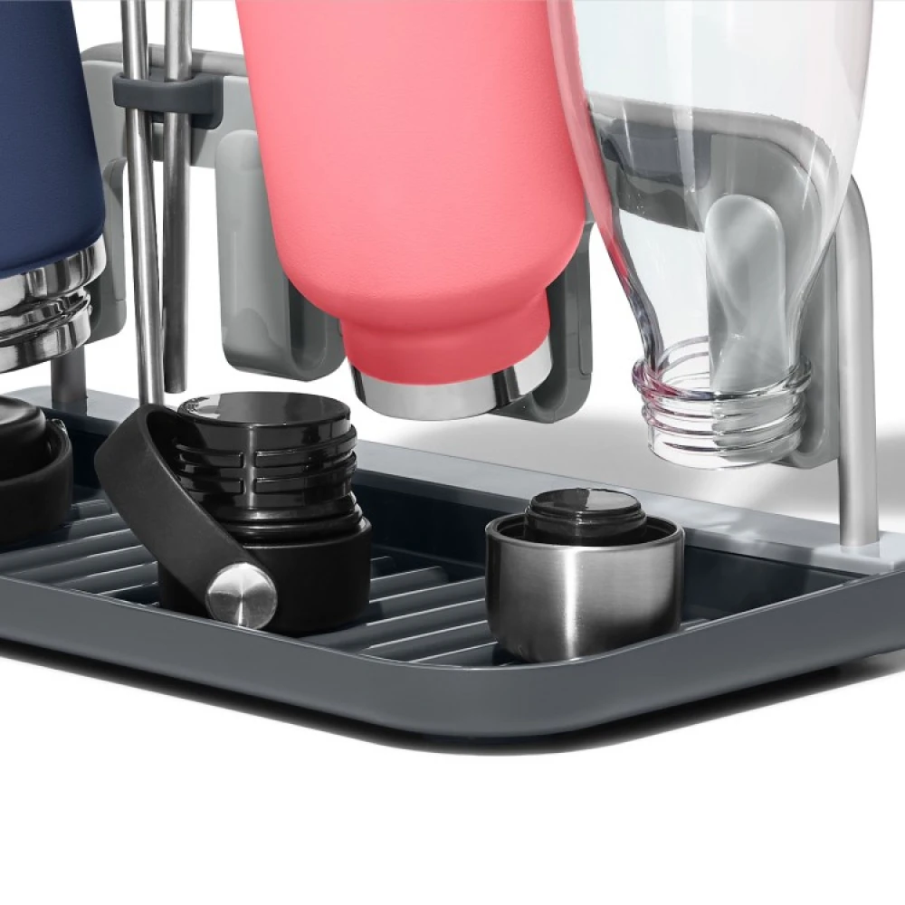 Med et tørrestativ til flasker kan du nemt tørre akavede vandflasker, termokander og vællingflasker derhjemme, efter træning og på arbejde. Tørrestativet har fire holdere til flasker, en stor drypbakke hvor du kan sætte lågene og to holdere til i alt fire sugerør.