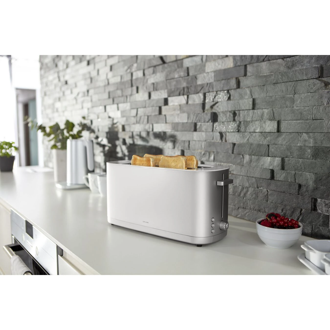 Denne højkvalitets ZWILLING brødrister med lang åbning til 4 skiver toast eller 2 lange skiver brød i et moderne design sikrer ensartet ristning. Skiverne bliver ristet jævnt på begge sider takket være de 4 separate varmeelementer på 1800 watt brødristeren. Færdigristede skiver flyver ikke ud af brødristeren – de glider. Soft-lift-funktionen sikrer, at brød og toastskiver hæves forsigtigt, og med den integrerede løftefunktion kan mindre skiver også løftes komfortabelt ud af brødristeren. Det er umuligt at brænde skiverne: brødristeren slukker automatisk efter den indstillede cyklus. Selv på den højeste indstilling bliver skiverne maksimalt mørkebrune. Hver proces kan straks afbrydes med stop-knappen. Krummer ender i den let aftagelige krummebakke. Med 7 ristningsniveauer og 3 automatiske programmer kan hver ristningsproces tilpasses dine behov. Med genopvarmningsfunktionen kan en skive, der er blevet kold, genopvarmes. Optøningsfunktionen tillader direkte ristning af frossen toast. Og bagelfunktionen med centrering af brødskiver muliggør ideelle resultater – ristet indvendigt og sprød udvendigt. Med den aftagelige rist kan 2 ekstra boller opvarmes eller ristes.